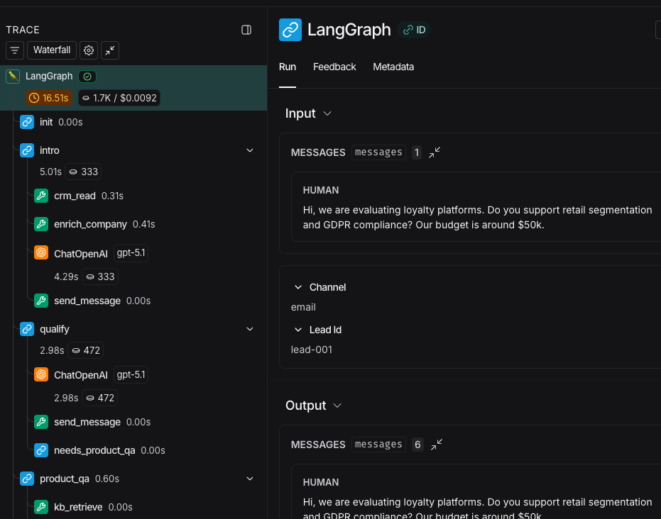 final_state = app.invoke(input={...}, config={"configurable": {"thread_id": "lead-001"}})The key point: once you have tool calls (CRM write, marketing trigger, scheduling), you need to debug a sequence of model + tool steps, not a single response.